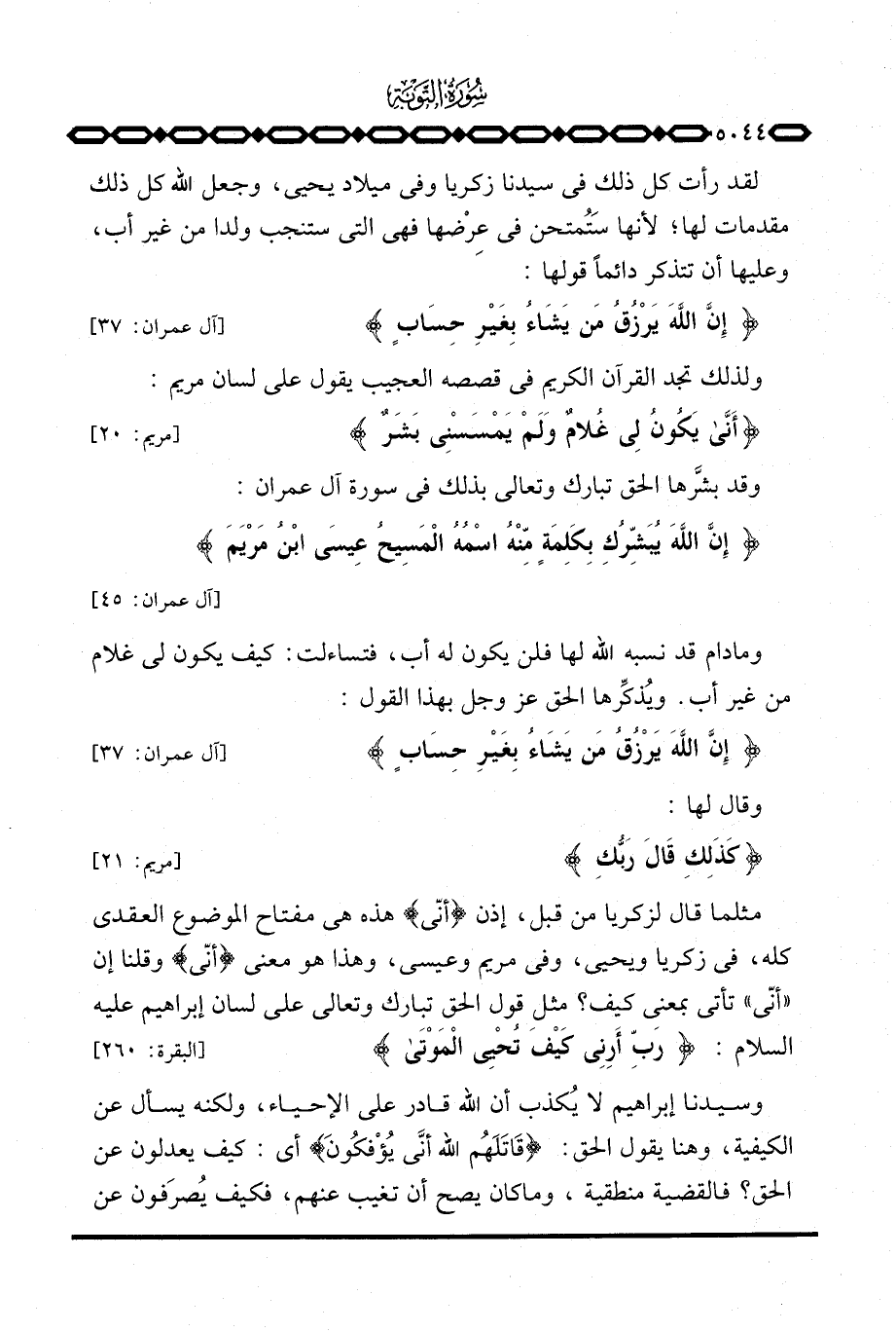 مثلما قال لزكريا من قبل، إذن {أنى} هذه هي مفتاح الموضوع العقدي كله، في زكريا ويحيى، وفي مريم وعيسى، وهذا هو معنى {أنى} وقلنا إن «أنّى» تأتي بمعنى كيف؟ مثل قول الحق تبارك وتعالى على لسان إبراهيم عليه السلام: {رَبِّ أَرِنِي كَيْفَ تُحْيِي الموتى} [البقرة: 260] .