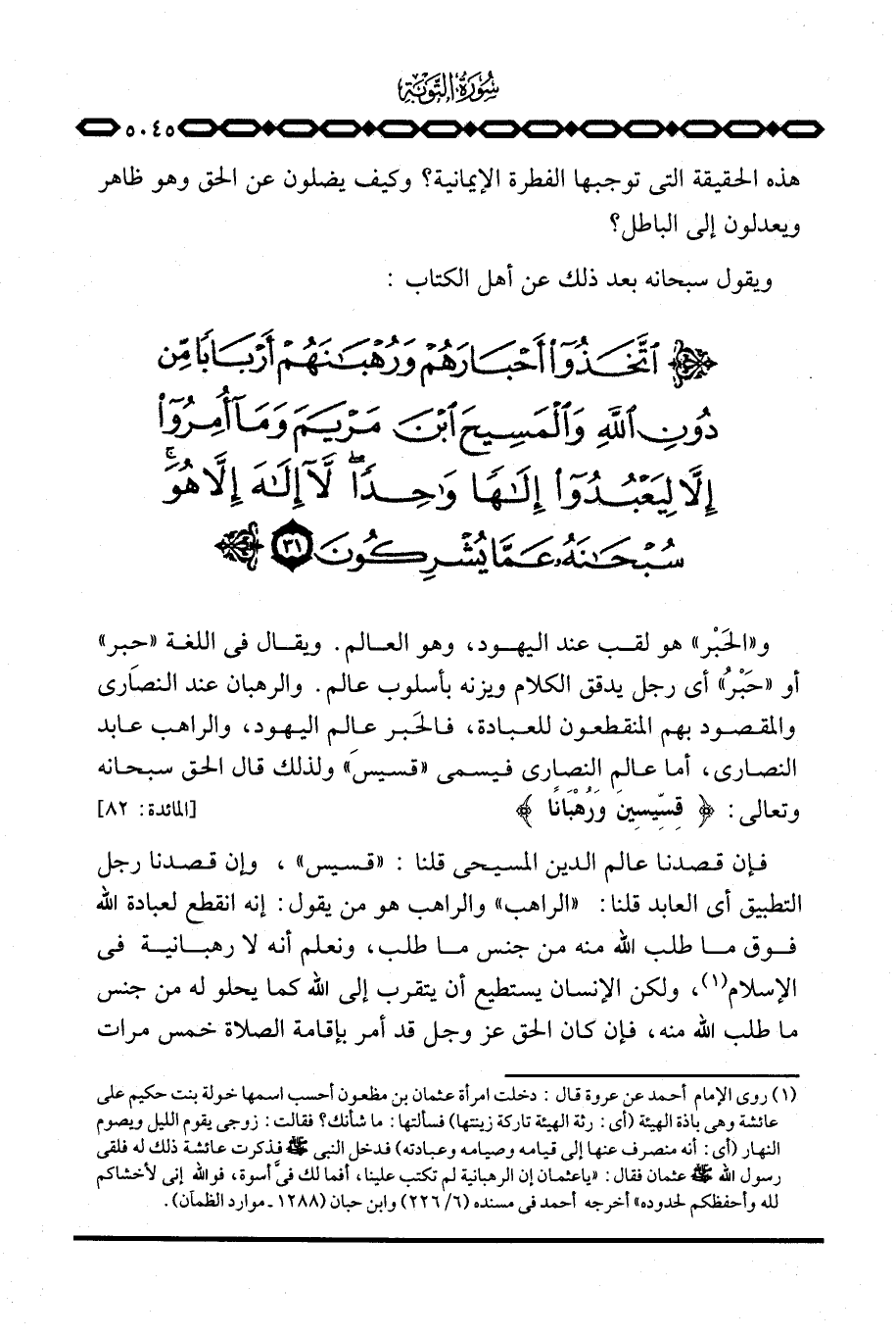 ويقول سبحانه بعد ذلك عن أهل الكتاب: {اتخذوا أَحْبَارَهُمْ وَرُهْبَانَهُمْ أَرْبَاباً مِّن دُونِ الله والمسيح ابن مَرْيَمَ ... }