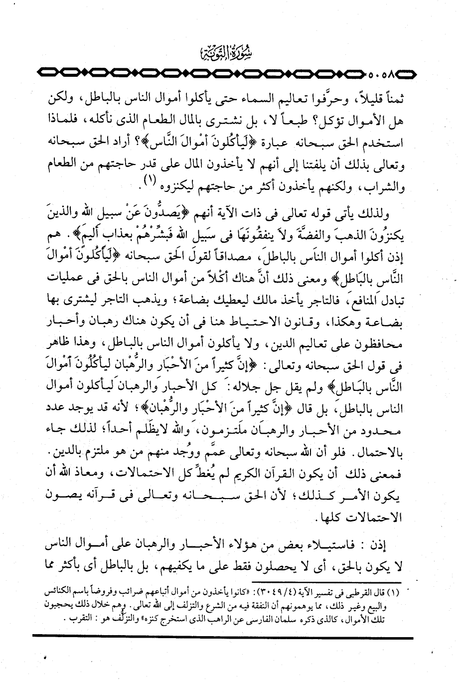 ولذلك يأتي قوله تعالى في ذات الآية أنهم {وَيَصُدُّونَ عَن سَبِيلِ الله والذين يَكْنِزُونَ الذهب والفضة وَلاَ يُنفِقُونَهَا فِي سَبِيلِ الله فَبَشِّرْهُمْ بِعَذَابٍ أَلِيمٍ} . هم إذن أكلوا أموال الناس بالباطل، مصداقاً لقول الحق سبحانه {لَيَأْكُلُونَ أَمْوَالَ الناس بالباطل} ومعنى ذلك أنَّ هناك أكْلاً من أموال الناس بالحق في عمليات تبادل المنافع، فالتاجر يأخذ مالك ليعطيك بضاعة؛ ويذهب التاجر ليشتري بها بضاعة وهكذا، وقانون الاحتياط هنا في أن يكون هناك رهبان وأحبار محافظون على تعاليم الدين، ولا يأكلون أموال الناس بالباطل، وهذا ظاهر في قول الحق سبحانه وتعالى: {إِنَّ كَثِيراً مِّنَ الأحبار والرهبان لَيَأْكُلُونَ أَمْوَالَ الناس بالباطل} ولم يقل جل جلاله: كل الأحبار والرهبان ليأكلون أموال الناس بالباطل، بل قال {إِنَّ كَثِيراً مِّنَ الأحبار والرهبان} ؛ لأنه قد يوجد عدد محدود من الأحبار والرهبان ملتزمون، والله لا يظلم أحداً؛ لذلك جاء بالاحتمال. فلو أن الله سبحانه وتعالى عمَّم ووُجد منهم من هو ملتزم بالدين. فمعنى ذلك أن يكون القرآن الكريم لم يُغطِّ كل الاحتمالات، ومعاذ الله أن يكون الأمر كذلك؛ لأن الحق سبحانه وتعالى في قرآنه يصون الاحتمالات كلها.