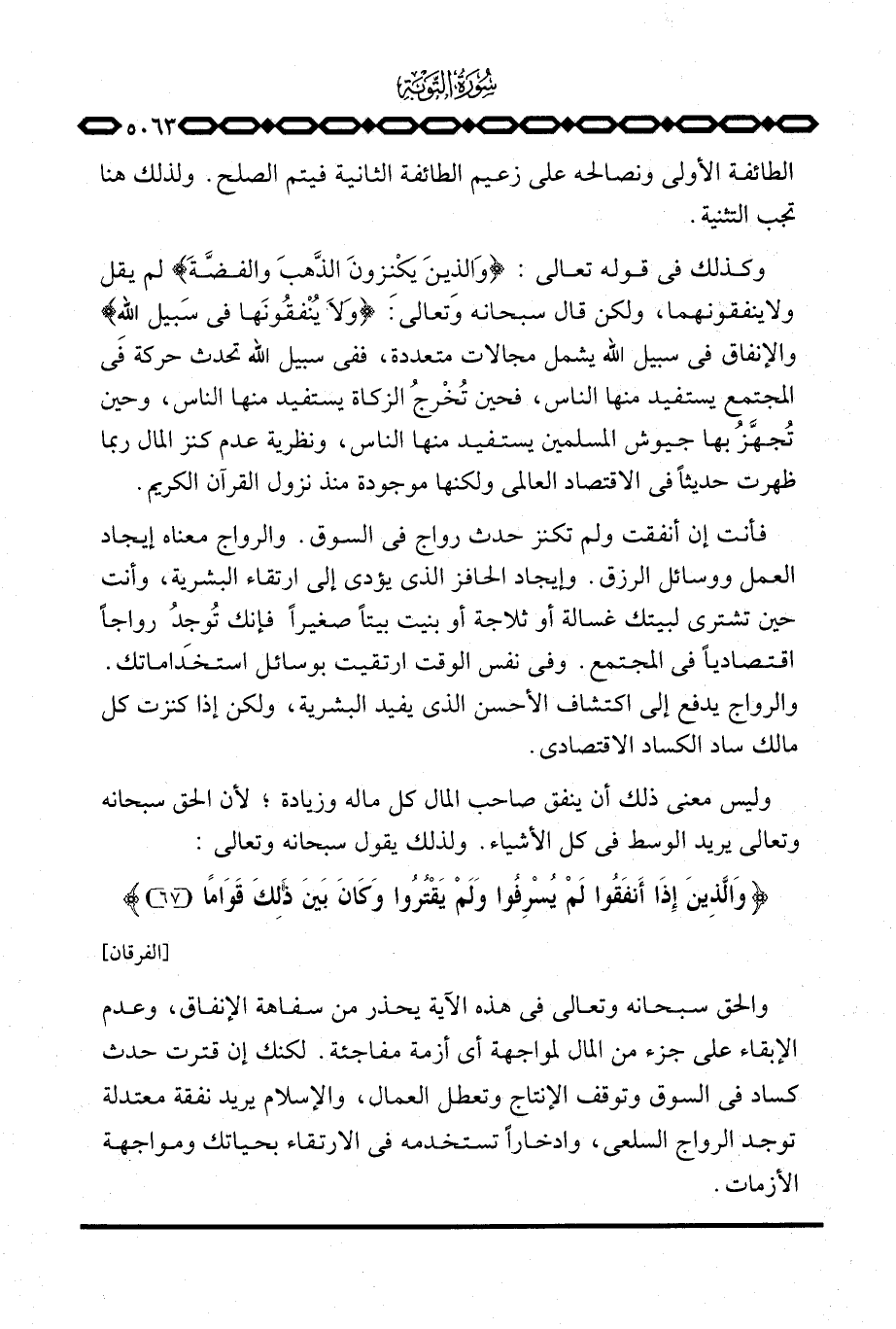 وكذلك في قوله تعالى: {والذين يَكْنِزُونَ الذهب والفضة} لم يقل ولا ينفقونهما، ولكن قال سبحانه وتعالى: {وَلاَ يُنفِقُونَهَا فِي سَبِيلِ الله} والإنفاق في سبيل الله يشمل مجالات متعددة، ففي سبيل الله تحدث حركة في المجتمع يستفيد منها الناس، فحين تُخْرجُ الزكاة يستفيد منها الناس، وحين تُجهَّزُ بها جيوش المسلمين يستفيد منها الناس، ونظرية عدم كنز المال ربما ظهرت حديثاً في الاقتصاد العالمي ولكنها موجودة منذ نزول القرآن الكريم.