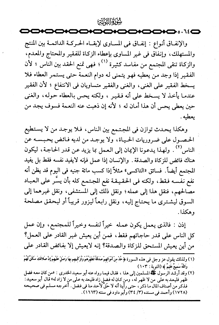 وهكذا يحدث توازن في المجتمع بين الناس، فلا يوجد من لا يستطيع الحصول على ضروريات الحياة، ولا يوجد من لديه فائض يحبسه عن الناس. ولهذا يدعونا الإيمان إلى العمل بما يزيد عن قدر الحاجة، ليكون هناك فائض للزكاة والصدقة. والإنسان إذا عمل فإنه لا يفيد نفسه فقط بل يفيد المجتمع أيضاً. فسائق «التاكسي» مثلاً إذا كسب مائة جنيه في اليوم قد يظن أنه نفع نفسه فقط، ولكنه في الحقيقة نفع المجتمع كله بأن يسَّر على العباد مصالحهم، فنقل هذا إلى عمله؛ ونقل ذلك إلى المستشفى، ونقل غيرهما إلى السوق ليشتري ما يحتاج إليه، ونقل رابعاً ليزور قريباً أو ليحقق مصلحة وهكذا.