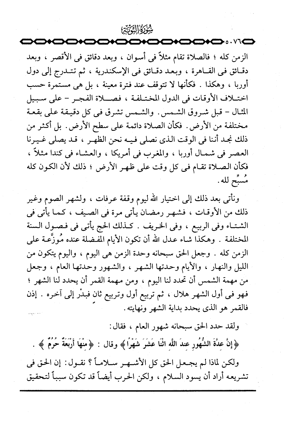 الزمن كله؛ فالصلاة تقام مثلاً في أسوان، وبعد دقائق في الأقصر، وبعد دقائق في القاهرة، وبعد دقائق في الإسكندرية، ثم تتدرج إلى دول أوربا، وهكذا. فكأنها لا تتوقف عند فترة معينة، بل هي مستمرة حسب اختلاف الأوقات في الدول المختلفة، فصلاة الفجر - على سبيل المثال - قبل شروق الشمس. والشمس تشرق في كل دقيقة على بقعة مختلفة من الأرض. فكأن الصلاة دائمة على سطح الأرض. بل أكثر من ذلك نجد أننا في الوقت الذي نصلي فيه نحن الظهر، قد يصلي غيرنا العصر في شمال أوربا، والمغرب في أمريكا، والعشاء في كندا مثلاً، فكأن الصلاة تقام في كل وقت على ظهر الأرض؛ ذلك لأن الكون كله مُسبِّح لله.