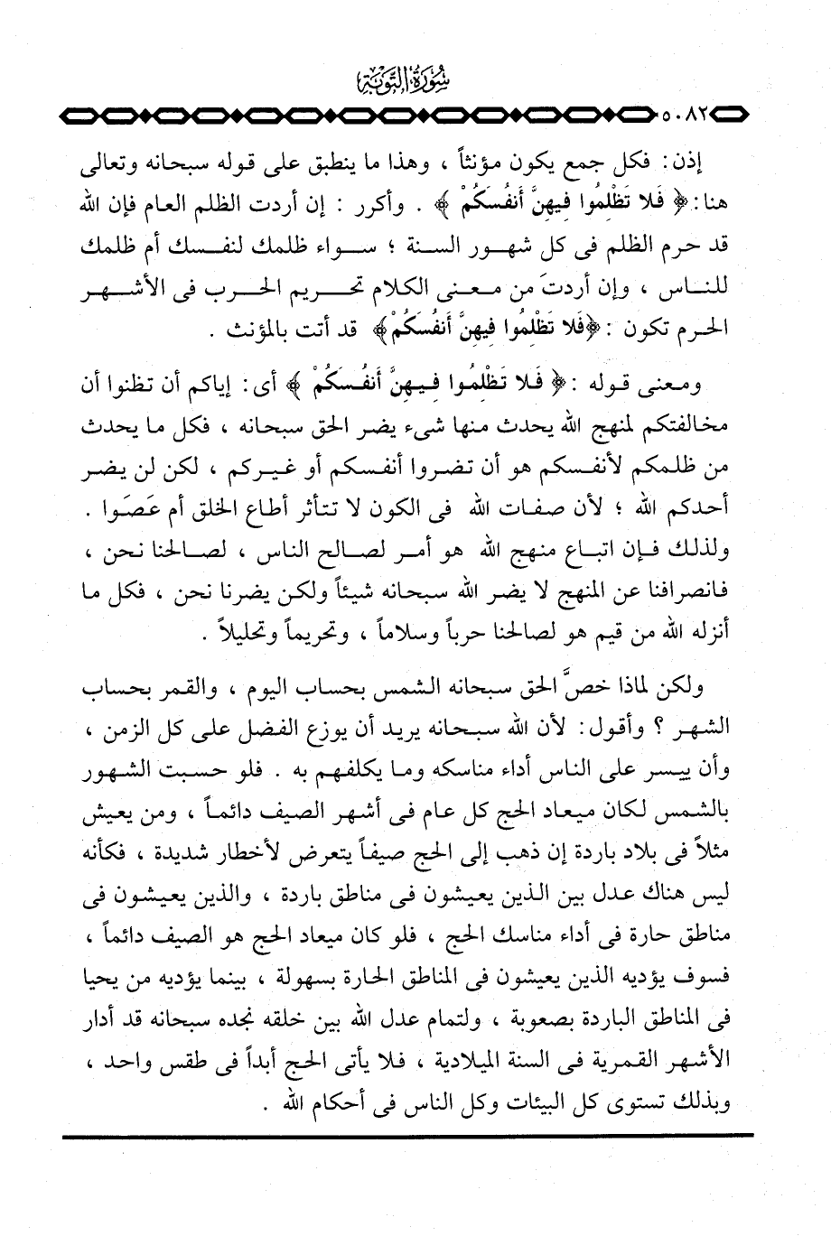 ولكن لماذا خصَّ الحق سبحانه الشمس بحساب اليوم، والقمر بحساب الشهر؟ وأقول: لأن الله سبحانه يريد أن يوزع الفضل على كل الزمن، وأن ييسر على الناس أداء مناسكه وما يكلفهم به. فلو حسبت الشهور بالشمس لكان ميعاد الحج كل عام في أشهر الصيف دائماً، ومن يعيش مثلاً في بلاد باردة إن ذهب إلى الحج صيفاً يتعرض لأخطار شديدة، فكأنه ليس هناك عدل بين الذين يعيشون في مناطق باردة، والذين يعيشون في مناطق حارة في أداء مناسك الحج، فلو كان ميعاد الحج هو الصيف دائماً، فسوف يؤديه الذين يعيشون في المناطق الحارة بسهولة، بينما يؤديه من يحيا في المناطق الباردة بصعوبة، ولتمام عدل الله بين خلقه نجده سبحانه قد أدار الأشهر القمرية في السنة الميلادية، فلا يأتي الحج أبداً في طقس واحد، وبذلك تستوي كل البيئات وكل الناس في أحكام الله.
