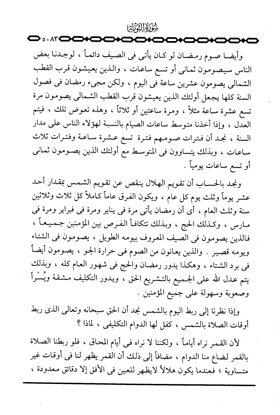 وأيضا صوم رمضان لو كان يأتي في الصيف دائماً، لوجدنا بعض الناس سيصومون ثماني أو تسع ساعات، والذين يعيشون قرب القطب الشمالي يصومون عشرين ساعة في اليوم، ولكن مجيء رمضان في فصول السنة كلها يجعل أولئك الذين يعيشون قرب القطب الشمالي يصومون مرة تسع عشرة ساعة مثلاً، ومرة ساعتين أو ثلاثاً، وهذه تعوض تلك، فيتم العدل، وإذا أخذنا متوسط ساعات الصيام بالنسبة لهؤلاء الناس على مدار السنة، نجد أن فترات صومهم فترة تسع عشرة ساعة وفترات ثلاث ساعات، وبذلك يتساوون في المتوسط مع أولئك الذين يصومون ثماني أو تسع ساعات يومياً.