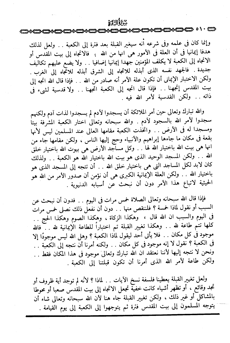 فإذا قال الله سبحانه وتعالى الصلاة خمس مرات في اليوم. . فدون أن نبحث عن السبب أو نقول لماذا خمسة؟ فلننقص منها. . دون أن نفعل ذلك نصلي خمس مرات في اليوم والسبب أن الله قال، وهكذا الزكاة، وهكذا الصوم وهكذا الحج. . كلها تتم طاعة لله. . وهكذا تغيير القبلة تم اختباراً للطاعة الإيمانية لله. . فالله موجود في كل مكان. . فلا يأتي أحد ليقول لماذا الكعبة؟ وهل الله ليس موجوداً إلا في الكعبة؟ نقول لا إنه موجود في كل مكان. . ولكنه أمرنا أن نتجه إلى الكعبة. . ونحن لا نتجه إليها لأننا نعتقد أن الله تبارك وتعالى موجود في هذا المكان فقط.