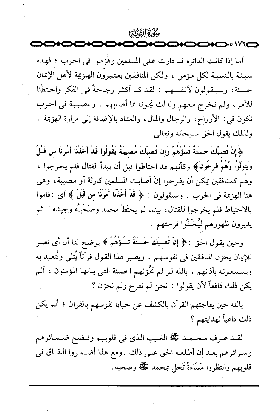وحين يقول الحق: {إِن تُصِبْكَ حَسَنَةٌ تَسُؤْهُمْ} يوضح لنا أن أي نصر للإيمان يحزن المنافقين في نفوسهم، ويصير هذا القول قرآناً يُتلى ويُتعبد به ويسمعونه بآذانهم، بالله لو لم تُحزنهم الحسنة التي ينالها المنافقين في نفوسهم، ويصير هذا القول قرآناً يُتلى ويُتعبد به ويسمعونه بآذانهم، بالله لو لم تُحزنهم الحسنة التي ينالها المؤمنون، ألم يكن ذلك دافعاً لأن يقولوا: نحن لم نفرح ولم نحزن؟