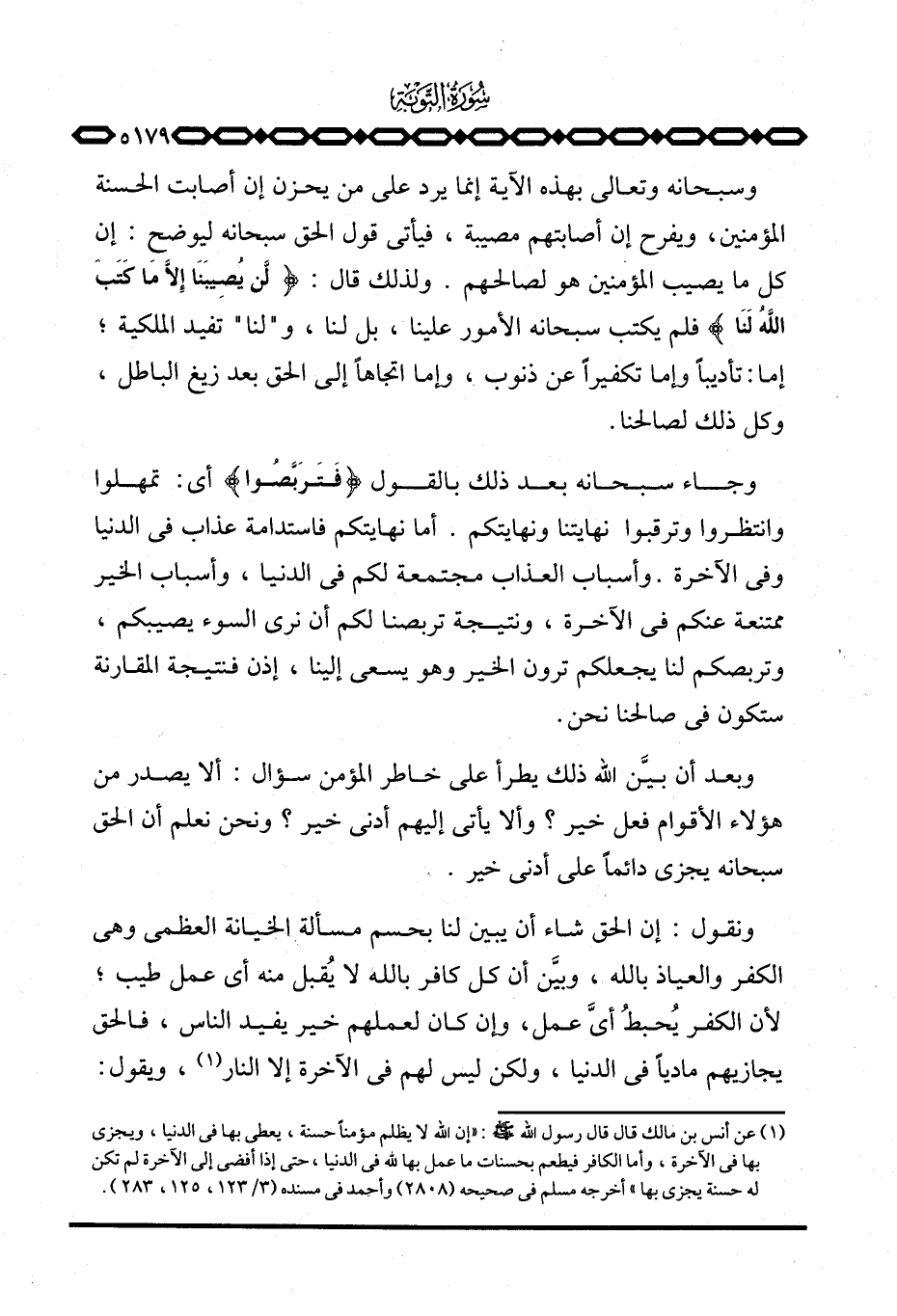 وسبحانه وتعالى بهذه الآية إنما يرد على من يحزن إن أصابت الحسنة المؤمنين، ويفرح إن أصابتهم مصيبة، فيأتي قول الحق سبحانه ليوضح: إن كل ما يصيب المؤمنين هو لصالحهم. ولذلك قال: {لَّن يُصِيبَنَآ إِلاَّ مَا كَتَبَ الله لَنَا} فلم يكتب سبحانه الأمور علينا، بل لنا، و «لنا» تفيد الملكية؛ إما: تأديباً وإما تكفيراً عن ذنوب، وإما اتجاهاً إلى الحق بعد زيغ الباطل، وكل ذلك لصالحنا.