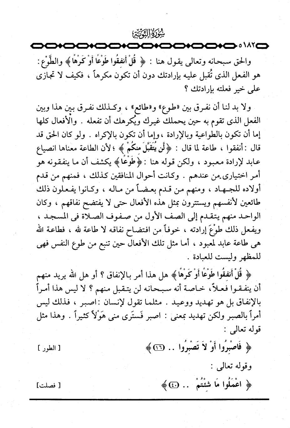 والأفعال كلها إما أن تكون بالطواعية وبالإرادة، وإما أن تكون بالإكراه. ولو كان الحق قد قال: أنفقوا، طاعة لما قال: {لَّن يُتَقَبَّلَ مِنكُمْ} ؛ لأن الطاعة معناها انصياع عابد لإرادة معبود، ولكن قوله هنا: {طَوْعاً} يكشف أن ما ينفقونه هو أمر اختياري من عندهم. وكانت أحوال المنافقين كذلك، فمنهم من قدم أولاده للجهاد، ومنهم من قدم بعضاً من ماله، وكانوا يفعلون ذلك طائعين لأنفسهم ويستترون بمثل هذه الأفعال حتى لا يفتضح نفاقهم، وكان الواحد يتقدم إلى الصف الأول من صفوف الصلاة في المسجد، ويفعل ذلك طوْعَ إرادته، خوفاً من افتضاح نفاقه لا طاعة لله، فطاعة الله هي طاعة عابد لمعبود، أما مثل تلك الأفعال حين تنبع من طوع النفس فهي للمظهر وليست للعبادة.