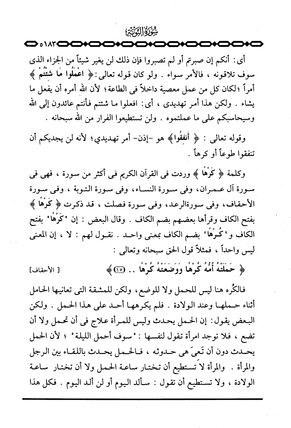 وكلمة {كَرْهاً} وردت في القرآن الكريم في أكثر من سورة، فهي في سورة آل عمران، وفي سورة النساء، وفي سورة التوبة، وفي سورة الأحقاف، وفي سورة الرعد، وفي سورة فصلت، قد ذكرت {كَرْهاً} بفتح الكاف وقرأها بعضهم بضم الكاف. وقال البعض: إن «كَرْهاً» بفتح الكاف و «كُرْهاً» بضم الكاف بمعنى واحد. نقول لهم: لا، إن المعنى ليس واحداً، فمثلاً قول الحق سبحانه وتعالى: {حَمَلَتْهُ أُمُّهُ كُرْهاً وَوَضَعَتْهُ كُرْهاً ... } [الأحقاف: 15]