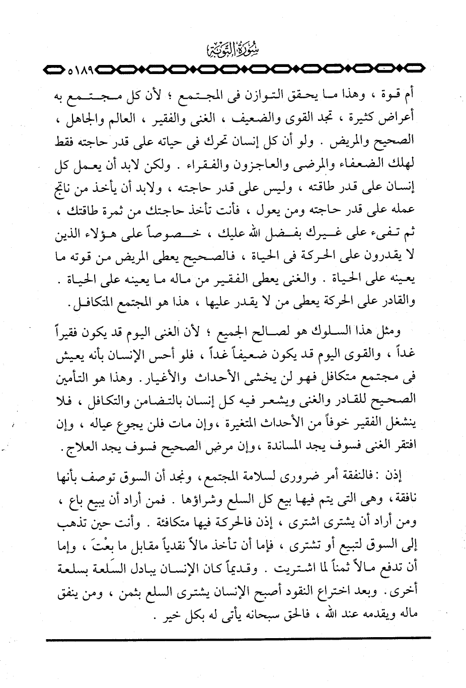 أم قوة، وهذا ما يحقق التوازن في المجتمع؛ لأن كل مجتمع به أعراض كثيرة، تجد القوي والضعيف، الغني والفقير، العالم والجاهل، الصحيح والمريض. ولو أن كل إنسان تحرك في حياته على قدر حاجته فقط لهلك الضعفاء والمرضى والعاجزون والفقراء. ولكن لابد أن يعمل كل إنسان على قدر طاقته، وليس على قدر حاجته، ولابد أن يأخذ من ناتج عمله على قدر حاجته ومن يعول، فأنت تأخذ حاجتك من ثمرة طاقتك، ثم تفيء على غيرك بفضل الله عليك، خصوصاً على هؤلاء الذين لا يقدرون على الحركة في الحياة، فالصحيح يعطي المريض من قوته ما يعينه على الحياة. والغني يعطي الفقير من ماله ما يعينه على الحياة. والقادر على الحركة يعطي من لا يقدر عليها، هذا هو المجتمع المتكافل.