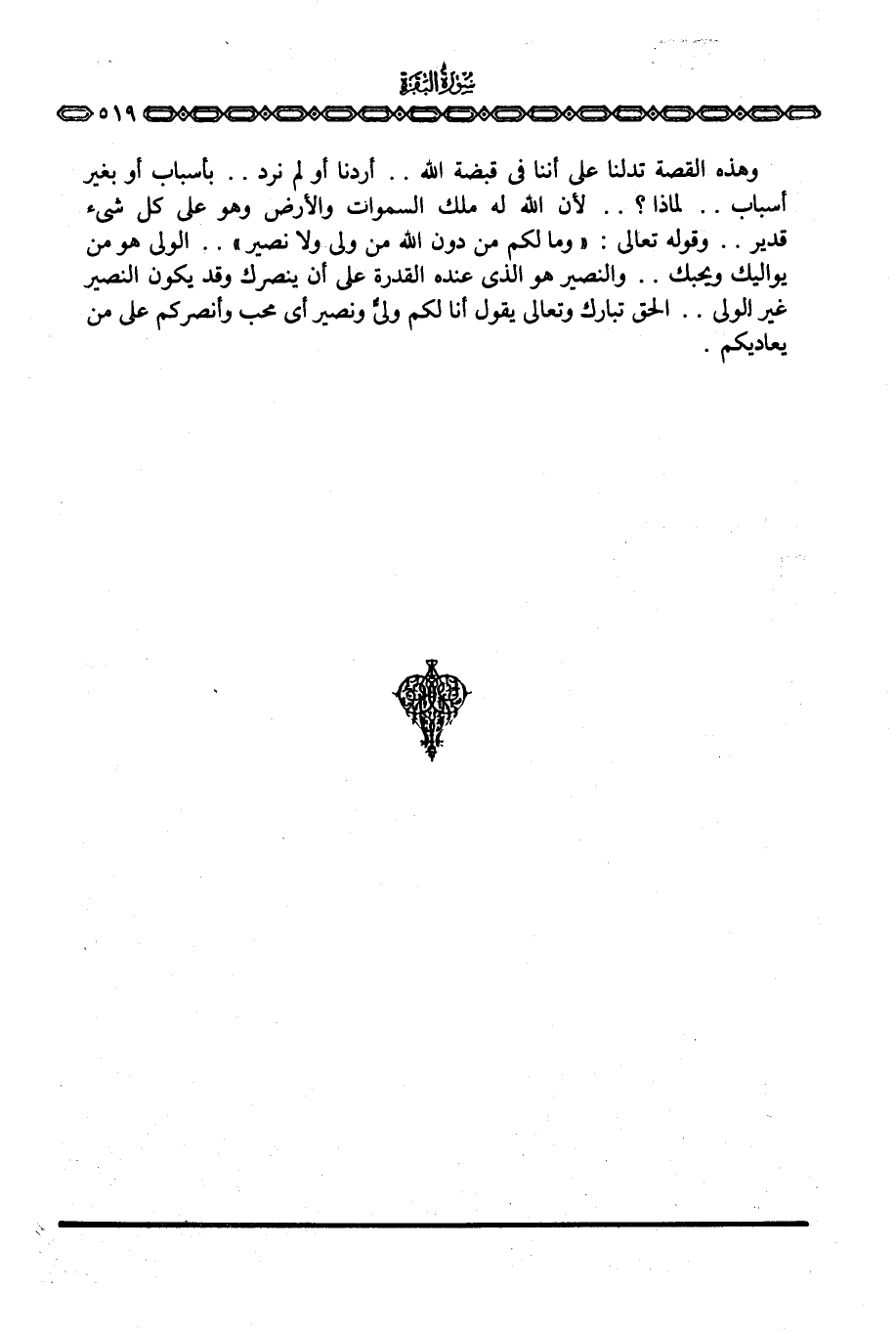 وهذه القصة تدلنا على أننا في قبضة الله. . أردنا أو لم نرد. . بأسباب أو بغير أسباب. . لماذا؟ . . لأن الله له ملك السماوات والأرض وهو على كل شيء قدير. . وقوله تعالى: {وَمَا لَكُمْ مِّن دُونِ الله مِن وَلِيٍّ وَلاَ نَصِيرٍ} . . الولي هو من يواليك ويحبك. . والنصير هو الذي عنده القدرة على أن ينصرك وقد يكون النصير غير الولي. . الحق تبارك وتعالى يقول أنا لكم وليٌّ ونصير أي محب وأنصركم على من يعاديكم.