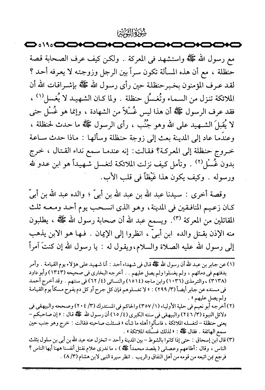 مع رسول الله صَلَّى اللَّهُ عَلَيْهِ وَسَلَّم َ واستشهد في المعركة ولكن كيف عرف الصحابة قصة حنظلة، مع أن هذه المسألة تكون سراً بين الرجل وزوجته لا يعرفه أحد؟ لقد عرف المؤمنون بخبر حنظلة حين رأى رسول الله صَلَّى اللَّهُ عَلَيْهِ وَسَلَّم َ بإشراقات الله أن الملائكة تنزل من السماء وتُغسِّل حنظلة. ولما كان الشهيد لا يُغسل، فقد عرف الرسول أن هذا ليس غُسْلاً من الشهادة، وإنما هو غُسْل حتى لا يُقْبِلَ الشهيد على الله وهو جُنُب، رأى الرسول صَلَّى اللَّهُ عَلَيْهِ وَسَلَّم َ ما حدث لحنظلة، وعندما عاد إلى المدينة بعث إلى زوجة حنظلة وسألها: ماذا حدث ساعة ساعة خروج حنظلة إلى المعركة؟ فقالت أنه سمع نداء القتال، خرج بدون غُسْل. وتأمل كيف نزلت الملائكة لتغسل شهيداً هو ابن عدو الله ورسوله. وكيف يكون هذا غَيْظاً في قلب الأب.