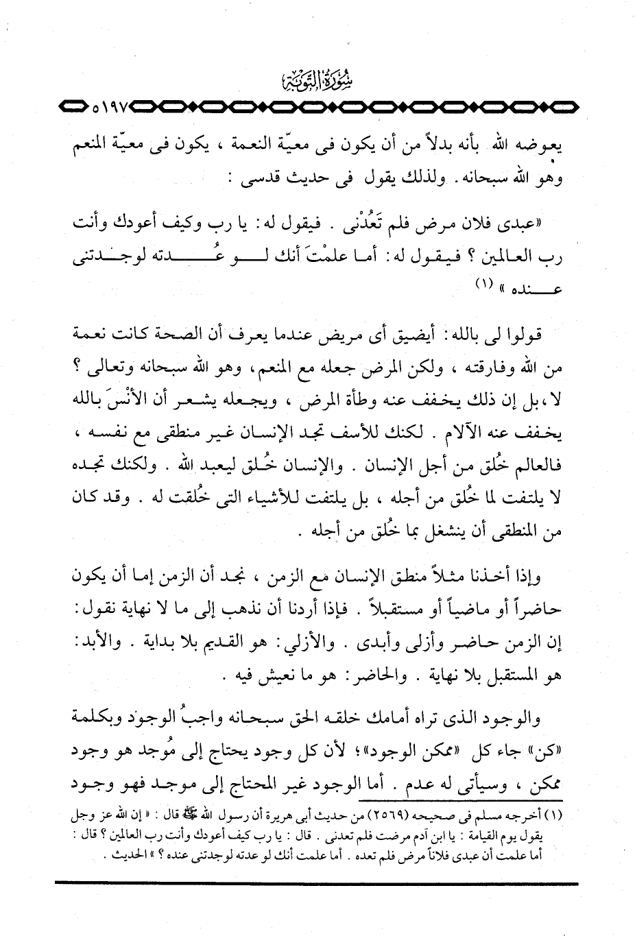 قولوا لي بالله: أيضيق أي مريض عندما يعرف أن الصحة كانت نعمة من الله وفارقته، ولكن المرض جعله مع المنعم، وهو الله سبحانه وتعالى؟ لا، بل إن ذلك يخفف عنه وطأة المرض، ويجعله يشعر أن الأنْسَ بالله يخفف عنه الآلام. لكنك للأسف تجد الإنسان غير منطقي مع نفسه، فالعالم خُلق من أجل الإنسان. والإنسان خُلق ليعبد الله. ولكنك تجده لا يلتفت لما خُلق من أجله، بل يلتفت للأشياء التي خُلقت له. وقد كان من المنطقي أن ينشغل بما خُلق من أجله.