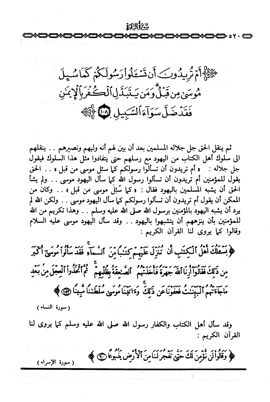 ثم ينقل الحق جل جلاله المسلمين بعد أن بين لهم أنه وليهم ونصيرهم. . ينقلهم إلى سلوك أهل الكتاب من اليهود مع رسلهم حتى يتفادوا مثل هذا السلوك فيقول جل جلاله: {أَمْ تُرِيدُونَ أَن تَسْأَلُواْ رَسُولَكُمْ كَمَا سُئِلَ موسى مِن قَبْلُ} . . الحق يقول للمؤمنين أم تريدون أن تسألوا رسول الله كما سأل اليهود موسى. . ولم يشأ الحق أن يشبه المسلمين باليهود فقال: {كَمَا سُئِلَ موسى مِن قَبْلُ} . . وكان من الممكن أن يقول أم تريدون أن تسألوا رسولكم كما سأل اليهود موسى. . ولكن الله لم يرد أن يشبه اليهود بالمؤمنين برسول الله صَلَّى اللَّهُ عَلَيْهِ وَسَلَّم َ. . وهذا تكريم من الله للمؤمنين بأن ينزههم أن يتشبهوا باليهود. . وقد سأل اليهود موسى عليه السلام وقالوا كما يروي لنا القرآن الكريم: {يَسْأَلُكَ أَهْلُ الكتاب أَن تُنَزِّلَ عَلَيْهِمْ كِتَاباً مِّنَ السمآء فَقَدْ سَأَلُواْ موسى أَكْبَرَ مِن ذلك فقالوا أَرِنَا الله جَهْرَةً فَأَخَذَتْهُمُ الصاعقة بِظُلْمِهِمْ ثُمَّ اتخذوا العجل مِن بَعْدِ مَا جَآءَتْهُمُ البينات فَعَفَوْنَا عَن ذلك وَآتَيْنَا موسى سُلْطَاناً مُّبِيناً} [النساء: 153]