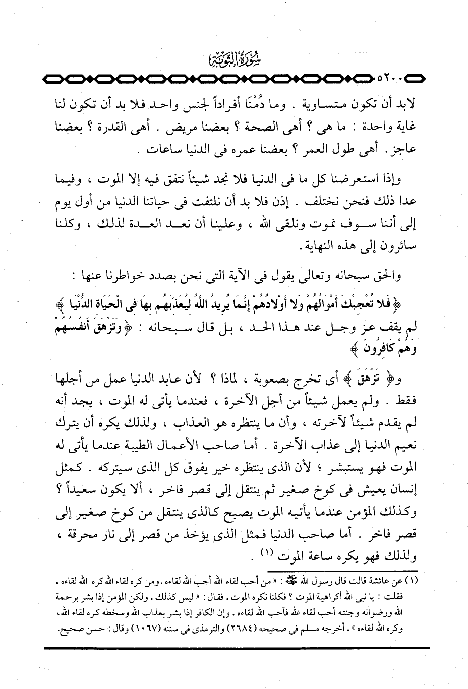 و {تَزْهَقَ} أي تخرج بصعوبة، لماذا؟ لأن عابد الدنيا عمل من أجلها فقط. ولم يعمل شيئاً من أجل الآخرة، فعندما يأتي له الموت، يجد أنه لم يقدم شيئاً لآخرته، وأن ما ينتظره هو العذاب، ولذلك يكره أن يترك نعيم الدنيا إلى عذاب الآخرة. أما صاحب الأعمال الطيبة عندما يأتي له الموت فهو يستبشر؛ لأن الذي ينتظره خير يفوق كل الذي سيتركه. كمثل إنسان يعيش في كوخ صغير ثم ينتقل إلى قصر فاخر، أإلا يكون سعيداً؟ وكذلك المؤمن عندما يأتيه الموت يصبح كالذي ينتقل من كوخ صغير إلى قصر فاخر. أما صاحب الدنيا فمثل الذي يؤخذ من قصر إلى نار محرقة، ولذلك فهو يكره ساعة الموت.