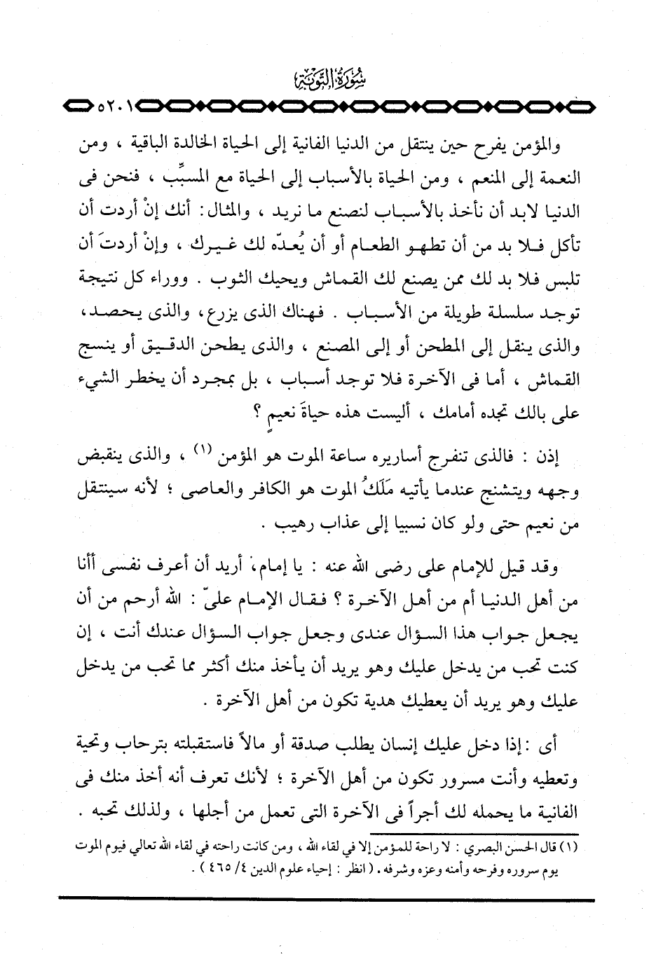 وقد قيل للإمام علي رَضِيَ اللَّهُ عَنْه: يا إمام، أريد أن أعرف نفسي أأنا من أهل الدنيا أم من أهل الآخرة؟ فقال الإمام عليّ: الله أرحم من أن يجعل جواب هذا السؤال عندي وجعل السؤال عندك أنت، إن كنت تحب من يدخل عليك وهو يريد أن يأخذ منك أكثر مما تحب من يدخل عليك وهو يريد أن يعطيك هدية تكون من أهل الآخرة.