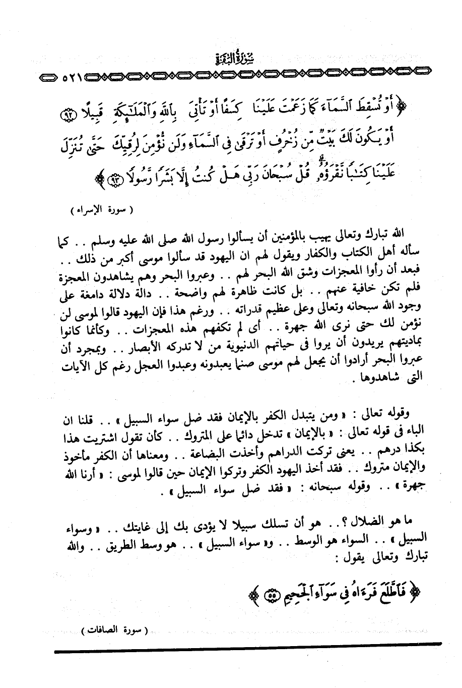 الله تبارك وتعالى يهيب بالمؤمنين أن يسألوا رسول الله صَلَّى اللَّهُ عَلَيْهِ وَسَلَّم َ. . كما سأله أهل الكتاب والكفار ويقول لهم أن اليهود قد سألوا موسى أكبر من ذلك. . فبعد أن رأوا المعجزات وشق الله البحر لهم. . وعبروا البحر وهم يشاهدون المعجزة فلم تكن خافية عنهم. . بل كانت ظاهرة لهم واضحة. . دالة دلالة دامغة على وجود الله سبحانه وتعالى وعلى عظيم قدراته. . ورغم هذا فإن اليهود قالوا لموسى لن نؤمن لك حتى نرى الله جهرة. . أي لم تكفهم هذه المعجزات. . وكأنما كانوا بماديتهم يريدون أن يروا في حياتهم الدنيوية من لا تدركه الأبصار. . وبمجرد أن عبروا البحر أرادوا أن يجعل لهم موسى صنما يعبدونه وعبدوا العجل رغم كل الآيات التي شاهدوها.