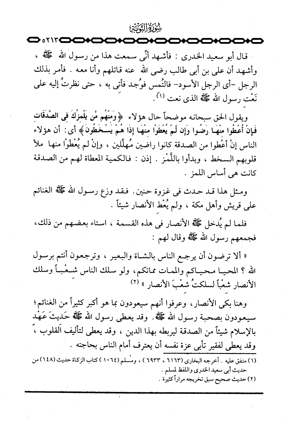 «ألا ترضون أن يرجع الناس بالشاة والبعير، وترجعون أنتم برسول الله؟ المحيا محياكم والممات مماتكم، ولو سلك الناس شِعْباً وسلك الأنصار شِعْباً لسلكتُ شِعْبَ الأنصار» وهنا بكى الأنصار، وعرفوا أنهم سيعودون بما هو أكبر كثيراً من الغنائم؛ سيعودون بصحبة رسول الله صَلَّى اللَّهُ عَلَيْهِ وَسَلَّم َ. وقد يعطي رسول الله صلى الله عليه حَديثَ عَهْدٍ بالإسلام شيئاً من الصدقة ليربطه بهذا الدين، وقد يعطى لتأليف القلوب، وقد يعطي لفقير تأبى عزة نفسه أن يعترف أمام الناس بحاجته.
