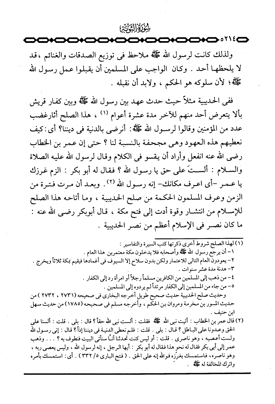 ولذلك كانت لرسول الله صَلَّى اللَّهُ عَلَيْهِ وَسَلَّم َ ملاحظة في توزيع الصدقات والغنائم، قد لا يلحظها أحد. وكان الواجب على المسلمين أن يقبلوا عمل رسول الله صَلَّى اللَّهُ عَلَيْهِ وَسَلَّم َ؛ لأن سلوكه هو الحكم، ولا بد أن نقبله.