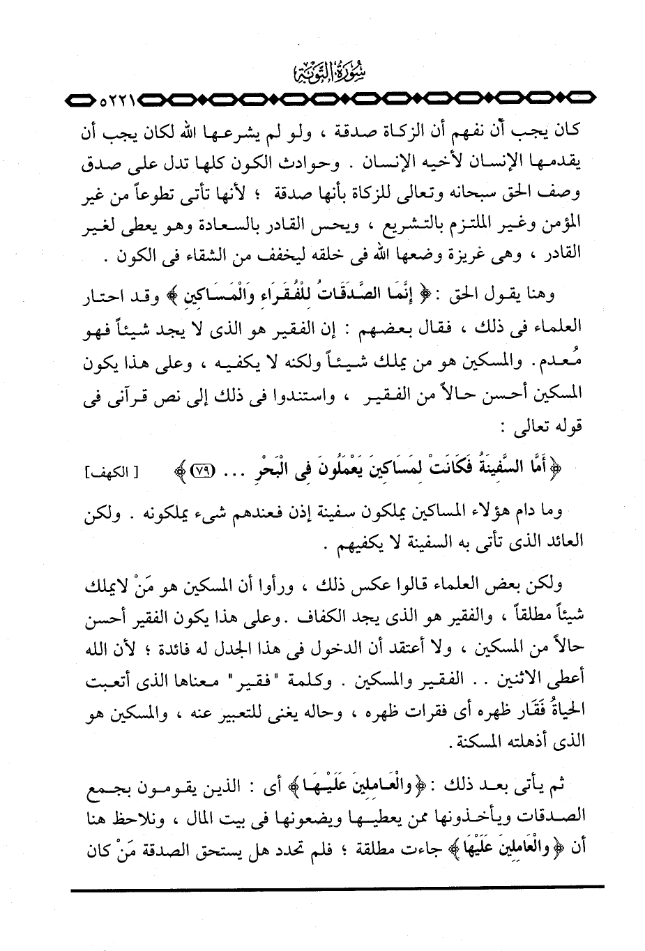 وهنا يقول الحق: {إِنَّمَا الصدقات لِلْفُقَرَآءِ والمساكين} وقد احتار العلماء في ذلك، فقال بعضهم: إن الفقير هو الذي لا يجد شيئاً فهو مُعدم. والمسكين هو من يملك شيئاً ولكنه لا يكفيه، وعلى هذا يكون المسكين أحسن حالاً من الفقير، واستندوا في ذلك إلى نص قرآني في قوله تعالى: {أَمَّا السفينة فَكَانَتْ لِمَسَاكِينَ يَعْمَلُونَ فِي البحر ... } [الكهف: 79]