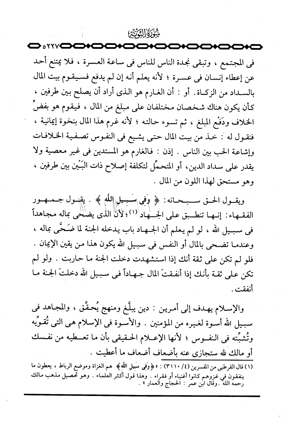 ويقول الحق سبحانه: {وَفِي سَبِيلِ الله} . يقول جمهور الفقهاء: إنها تنطبق على الجهاد؛ لأن الذي يضحي بماله مجاهداً في سبيل الله، لو لم يعلم أن الجهاد باب يدخله الجنة لما ضَحَّى بماله، وعندما تضحي بالمال أو النفس في سبيل الله يكون هذا من يقين الإيمان. فلو لم تكن على ثقة أنك إذا استشهدت دخلت الجنة ما حاربت. ولو لم تكن على ثقة بأنك إذا أنفقتَ المال جهاداً في سبيل الله دخلتَ الجنة ما ما أنفقت.