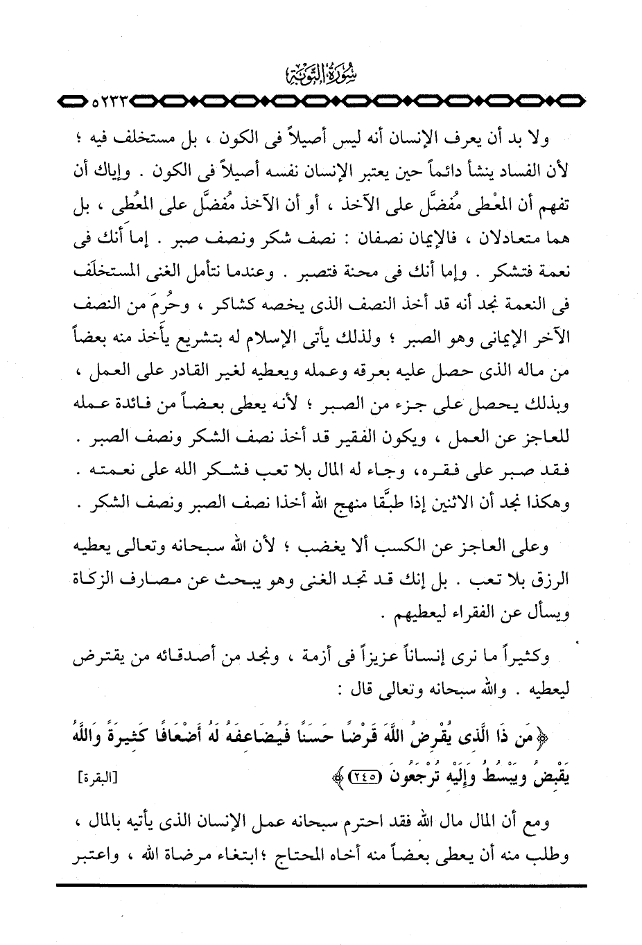 ولا بد أن يعرف الإنسان أنه ليس أصيلاً في الكون، بل مستخلف فيه؛ لأن الفساد ينشأ دائماً حين يعتبر الإنسان نفسه أصيلاً في الكون. وإياك أن تفهم أن المعْطى مُفضَّل على الآخذ، أو أن الآخذ مُفضَّل على المُعطي، بل هما متبادلان، فالإيمان نصفان: نصف شكر ونصف صبر.