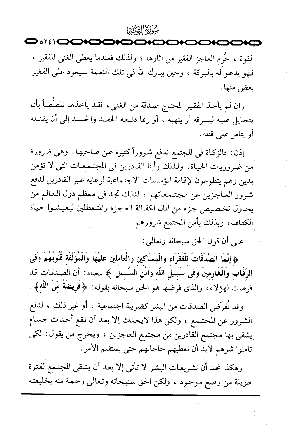 إذن: فالزكاة في المجتمع تدفع شروراً كثيرة عن صاحبها. وهي ضرورة من ضروريات الحياة. ولذلك رأيناه القادرين في المجتمعات التي لا ترمن بدين وهم يتطوعون لإقامات المؤسسات الاجتماعية لرعاية غير القادرين لدقع شرور العاجزين عن مجتمعاتهم؛ لذلك تجد في معظم دول العالم من يحاول تخصيص جزء من المال لكفالة العجزة والمتعطلين ليعيشوا حياة الكفاف، وبذلك يأمن المجتمع شرورهم.