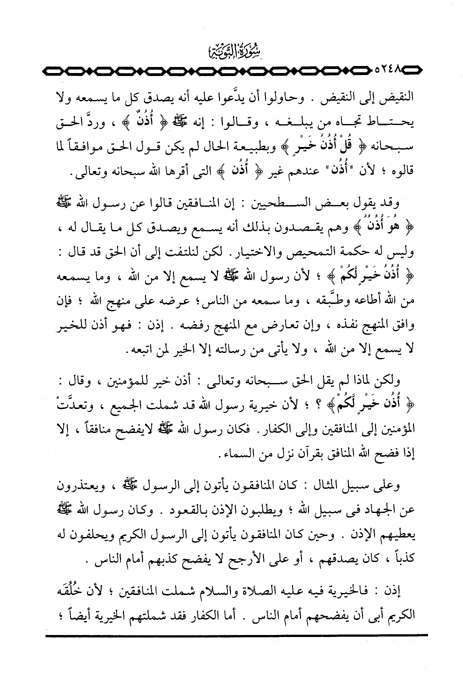 النقيض إلى النقيض. وحاولوا أن يدَّعوا أنه يصدق كل ما يسمعه ولا يحتاط تجاه من يبلغه، وقالوا: إنه صَلَّى اللَّهُ عَلَيْهِ وَسَلَّم َ {أُذُنٌ} ، وردَّ الحق سبحانه {قُلْ أُذُنُ خَيْرٍ} وبطبيعة الحال لم يكن قول الحق موافقاً لما قالوه؛ لأن «أُذُن» عندهم غير {أُذُن} التي أقرها الله سبحانه وتعالى.