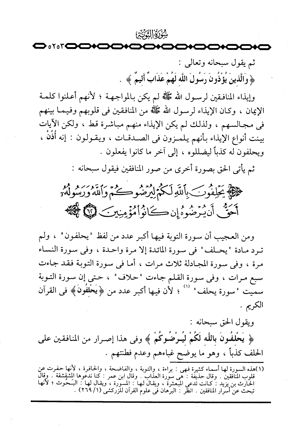 ومن العجيب أن سورة التوبة فيها أكبر عدد من لفظ «يحلفون» ، ولم ترد مادة «يحلف» في سورة المائدة إلا مرة واحدة، وفي سورة النساء مرة، وفي سورة المجادلة ثلاث مرات، أما في سورة التوبة فقد جاءت سبع مرات، وفي سورة القلم جاءت «حلاف» ، حتى إن سورة التوبة سميت «سورة يحلف» ؛ لأن فيها أكبر عدد من {يَحْلِفُونَ} في القرآن الكريم.