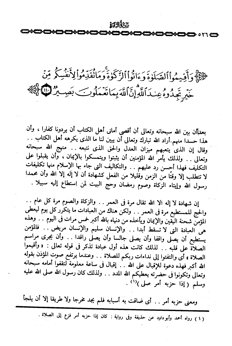 إن شهادة لا إله إلا الله تقال مرة في العمر. . والزكاة والصوم مرة كل عام. . والحج للمستطيع مرة في العمر. . ولكن هناك من العبادات ما يتكرر كل يوم ليعطي المؤمن شحنة اليقين والإيمان ويأخذه من دنياه بالله أكبر خمس مرات في اليوم. . وهذه هي العبادة التي لا تسقط أبدا. . والإنسان سليم والإنسان مريض. . فالمؤمن يستطيع أن يصلي واقفا وأن يصلي جالسا وأن يصلي راقدا. . وأن يجري مراسم الصلاة على قلبه. . لذلك كانت هذه أول عبادة تذكر في قوله تعالى: {وَأَقِيمُواْ الصلاة} أي والتفتوا إلى نداءات ربكم للصلاة. . وعندما يرتفع صوت المؤذن بقوله الله أكبر فهذه دعوة للإقبال على الله. . إقبال في ساعة معلومة لتقفوا أمامه سبحانه وتعالى وتكونوا في حضرته يعطيكم الله المدد. . ولذلك كان رسول الله صَلَّى اللَّهُ عَلَيْهِ وَسَلَّم َ «إذا حزبه أمر صلى»