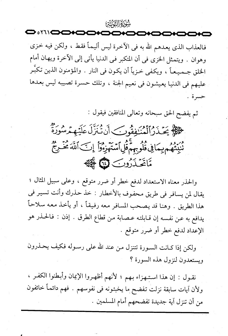 والحذر معناه الاستعداد لدفع خطر أو ضرر متوقع، وعلى سبيل المثال؛ يقال لمن يسافر في طريق محفوف بالأخطار: خذ حذرك وأنت تسير في هذا الطريق. وهنا قد يصحب المسافر معه رفيقاً، أو يأخذ معه سلاحاً يدافع به عن نفسه إن قابلته عصابة من قطاع الطرق. إذن: فالحذر هو الإعداد لدفع خطر أو ضرر متوقع.