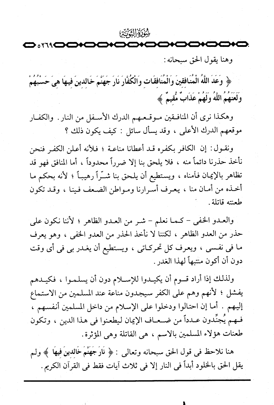 هنا نلاحظ في قول الحق سبحانه وتعالى: {نَارَ جَهَنَّمَ خَالِدِينَ فِيهَا} ولم يقل الحق بالخلود أبداً في النار إلا في ثلاث آيات فقط في القرآن الكريم.