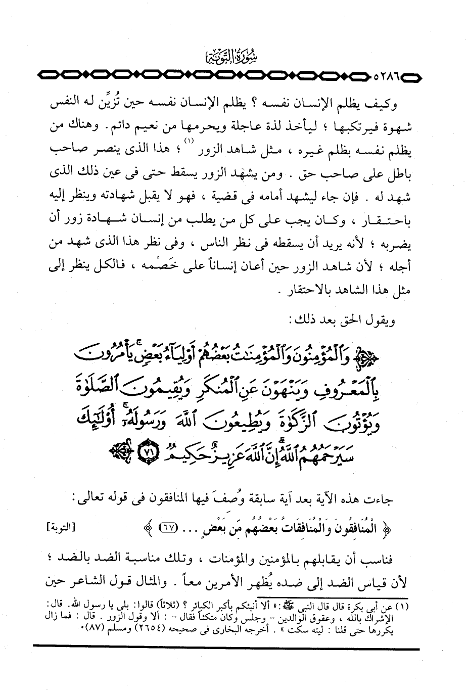 وكيف يظلم الإنسان نفسه؟ يظلم الإنسان نفسه حين تُزيِّن له النفس شهوة فيرتكبها؛ ليأخذ لذة عاجلة ويحرمها من نعيم دائم. وهناك من يظلم نفسه بظلم غيره، مثل شاهد الزور؛ هذا الذي ينصر صاحب باطل على صاحب حق. ومن يشهد الزور يسقط حتى في عين ذلك الذي شهد له. فإن جاء ليشهد أمامه في قضية، فهو لا يقبل شهادته وينظر إليه باحتقار، وكان يجب على من يطلب من إنسان شهادة زور أن يضربه؛ لأنه يريد أن يسقطه في نظر الناس، وفي نظر هذا الذي شهد من أجله؛ لأن شاهد الزور حين أعان إنساناً على خَصْمِه، فالكل ينظر إلى مثل الشاهد بالاحتقار.