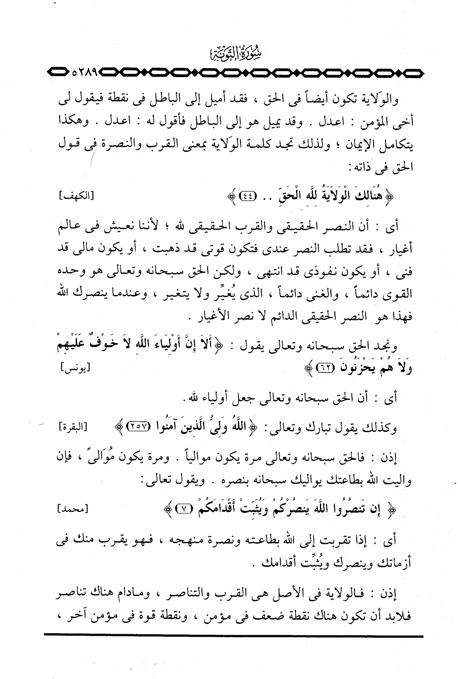 والوَلاية تكون أيضاً في الحق، فقد أميل إلى الباطل في نقطة فيقول لي أخي المؤمن: اعدل. وقد يميل هو إلى الباطل فأقول له: اعدل. وهكذا يتكامل الإيمان، ولذلك تجد كلمة الوَلاية بمعنى القرب والنصرة في قول الحق في ذاته: {هُنَالِكَ الولاية لِلَّهِ الحق ... } [الكهف: 44]