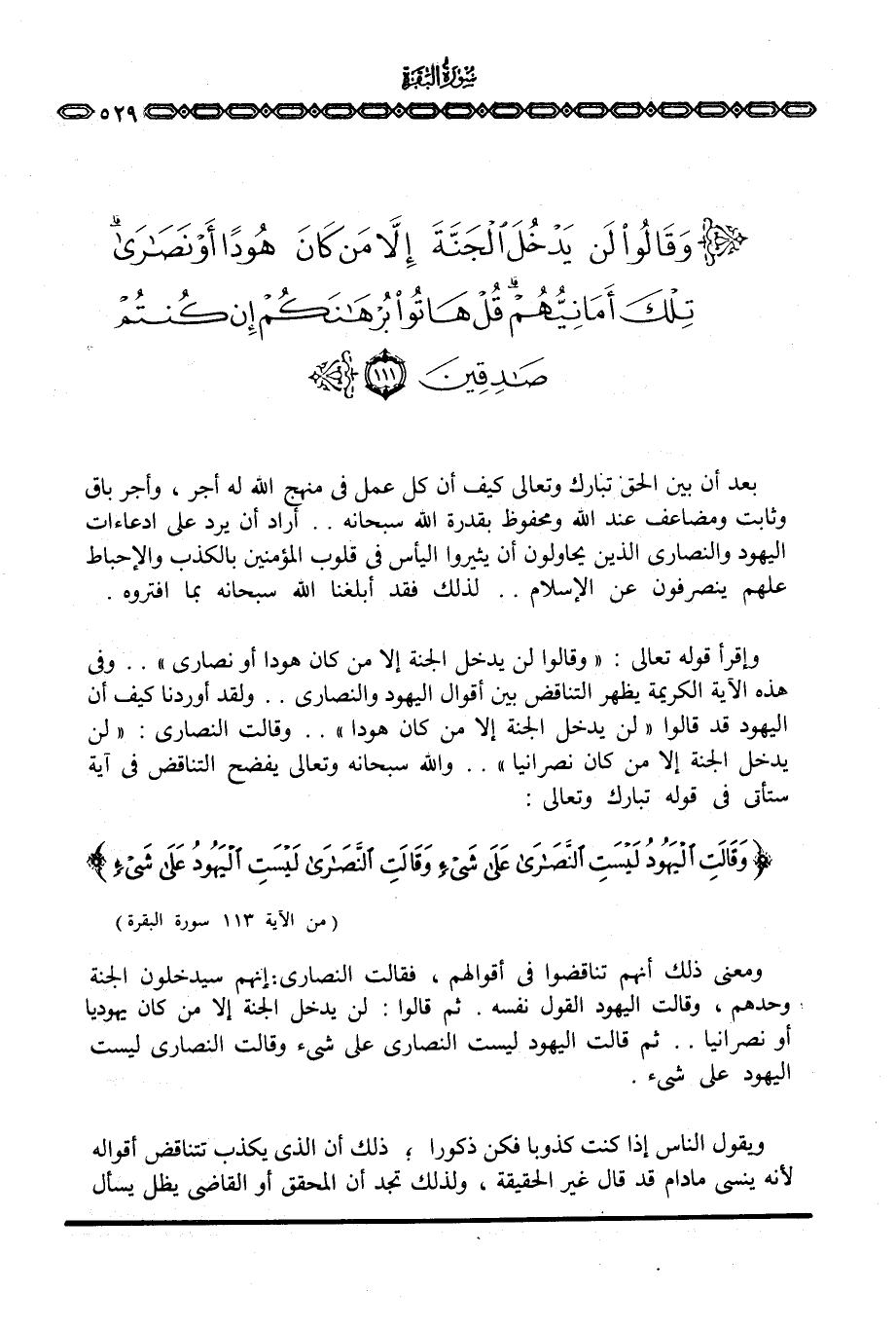 واقرأ قوله تعالى: {وَقَالُواْ لَن يَدْخُلَ الجنة إِلاَّ مَن كَانَ هُوداً أَوْ نصارى} . . وفي هذه الآية الكريمة يظهر التناقض بين أقوال اليهود والنصارى. . ولقد أوردنا كيف أن اليهود قد قالوا {لَن يَدْخُلَ الجنة إِلاَّ مَن كَانَ هُوداً} . . وقالت النصارى: «لن يدخل الجنة إلا من كان نصرانيا» . . والله سبحانه وتعالى يفضح التناقض في آية ستأتي في قوله تبارك وتعالى: {وَقَالَتِ اليهود لَيْسَتِ النصارى على شَيْءٍ وَقَالَتِ النصارى لَيْسَتِ اليهود على شَيْءٍ} [البقرة: 113]