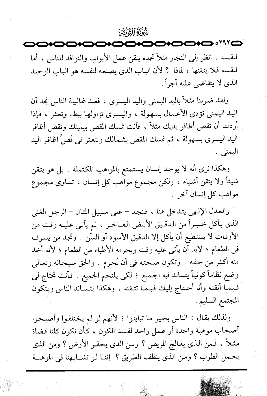 وهكذا نرى أنه لا يوجد إنسان يستمتع بالمواهب المكتملة. بل هو يتقن شيئاً ولا يتقن أشياء، ولكن مجموع مواهب كل إنسان، تساوي مجموع مواهب كل إنسان آخر.