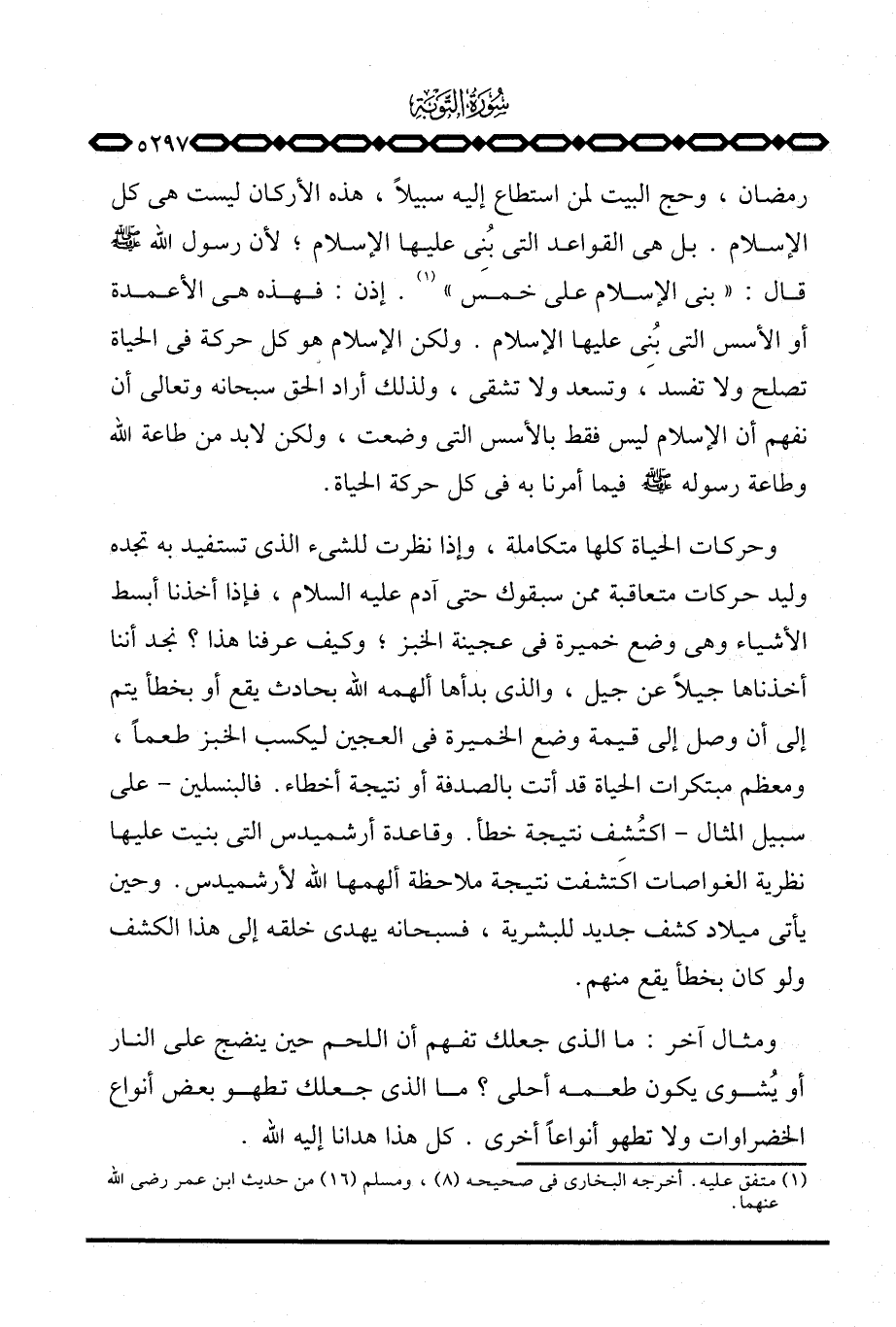 رمضان، وحج البيت لمن استطاع إليع سبيلاً، هذه الأركان ليست هي كل الإسلام. بل هي القواعد التي بُني عليها الإسلام؛ لأن رسول الله صَلَّى اللَّهُ عَلَيْهِ وَسَلَّم َ قال: «بني الإسلام على خمس» . إذن: فهذه هي الأعمدة أو الأسس التي بُني عليها الإسلام. ولكن الإسلام هو كل حركة في الحياة تصلح ولا تفسد، وتسعد ولا تشقي، ولذلك أراد الحق سبحانه وتعالى أن نفهم أن الإسلام ليس فقط بالأسس التي وضعت، ولكن لا بد من طاعة الله وطاعة رسوله صَلَّى اللَّهُ عَلَيْهِ وَسَلَّم َ فيما أمرنا به في كل حركة الحياة.