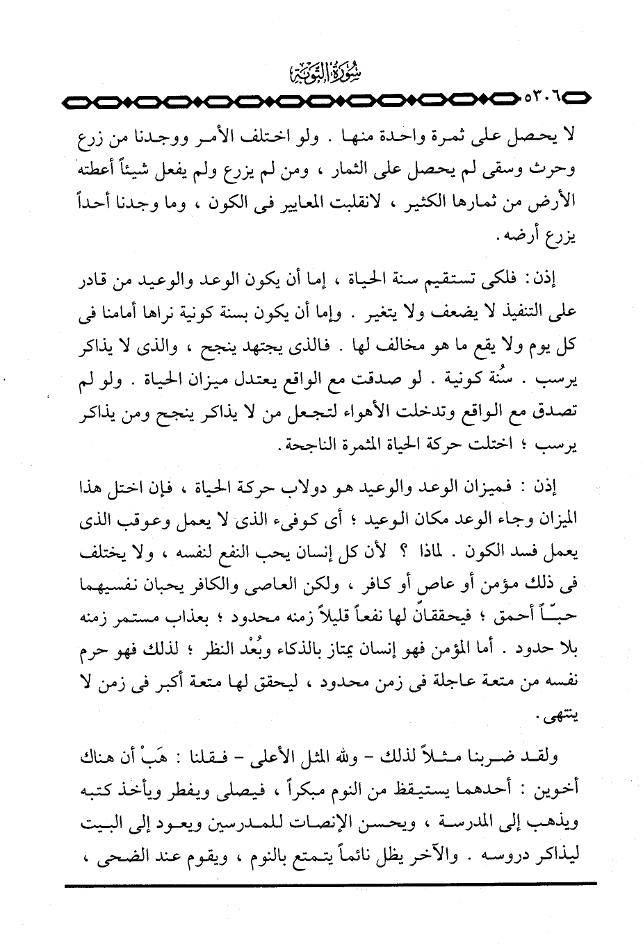 إذن: فميزان الوعد والوعيد هو دولاب حركة الحياة، فإن اختل هذا الميزان وجاء الوعد مكان الوعيد؛ أي كوفئ الذي لا يعمل وعوقب الذي يعمل فسد الكون. لماذا؟ لأن كل إنسان يجب النفع لنفسه، ولا يختلف في ذلك مؤمن أو عاصٍ أو كافر، ولكن العاصي والكافر يحبان نفسيهما حبّاً أحمق؛ فيحققان لها نفعاً قليلاً زمنه محدود؛ بعذاب مستمر زمنه بلا حدود. أما المؤمن فهو إنسان يمتاز بالذكاء وبُعْد النظر؛ لذلك فهو حرم نفسه من متعة عاجلة في زمن محدود، ليحقق لها متعة أكبر في زمن لا ينتهي.