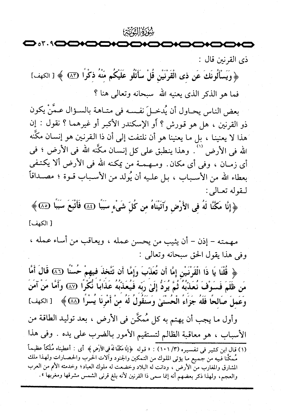 بعض الناس يحاول أن يُدخلَ نفسه في متاهة بالسؤال عمَّنْ يكون ذو القرنين، هل هو قورش؟ أو الإسكندر الأكبر أو غيرهما؟ نقول: إن هذا لا يعنينا، بل ما يعنينا هو أن نلتفت إلى أن ذا القرنين هو إنسان مكَّنه الله في الأرض. وهذا ينطبق على كل إنسان مكَّنه الله في الأرض؛ في أي زمان، وفي أي مكان. ومهمة من يمكنه الله في الأرض ألا يكتفي بعطاء الله من الأسباب، بل عليه أن يُولد من الأسباب قوة؛ مصداقاً لقوله تعالى: {إِنَّا مَكَّنَّا لَهُ فِي الأرض وَآتَيْنَاهُ مِن كُلِّ شَيْءٍ سَبَباً فَأَتْبَعَ سَبَباً} [الكهف: 84 - 85]