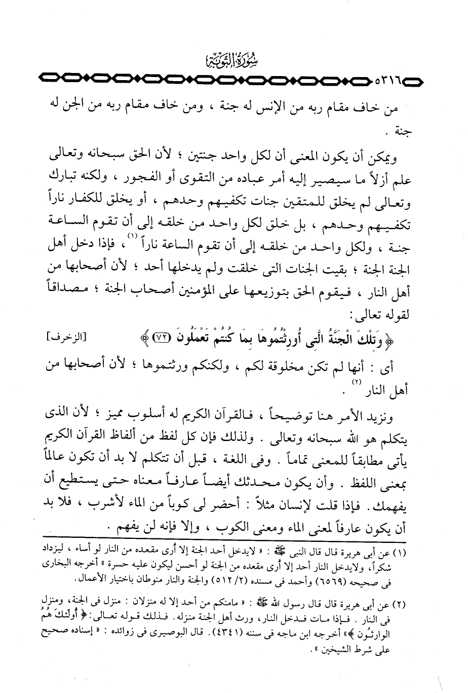 ويمكن أن يكون المعنى أن لكل واحد جنتين؛ لأن الحق سبحانه وتعالى علم أزلاً ما سيصير إليه من أمر عباده من التقوى أو الفجور، ولكنه تبارك وتعالى لم يخلق للمتقين جنات تكفيهم وحدهم، أو يخلق للكفار ناراً تكفيهم وحدهم، بل خلق لكل واحد من خلقه إلى أن تقوم الساعة جنة، ولكل واحد من خلقه إلى أن تقوم الساعة ناراً، فإذا دخل أهل الجنة الجنة؛ بقيت الجنات التي خلقت ولم يدخلها أحد؛ لأن أصحابها من أهل النار، فيقوم الحق بتوزيعه على المؤمنين أصحاب الجنة؛ مصداقاً لقوله تعالى: {وَتِلْكَ الجنة التي أُورِثْتُمُوهَا بِمَا كُنتُمْ تَعْمَلُونَ} [الزخرف: 72]