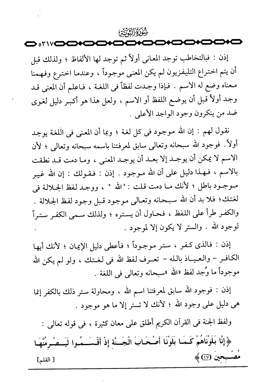 نقول لهم: إن الله موجود في كل لغة؛ وبما أن المعنى في اللغة يوجد أولاً. فوجود الله سبحانه وتعالى سابق لمعرفتنا باسمه سبحانه وتعالى؛ لأن الاسم لا يمكن أن يوجد إلا بعد أن يوجد المعنى، وما دمت قد نطقت بالاسم، فهذا دليل على أن الله موجود. إذن: فقولك: إن الله غير موجود باطل؛ لأنك ما دمت قلت: «الله» ، ووجد لفظ الجلالة في لغتك؛ فلا بد أن الله سبحانه وتعالى موجود قبل وجود لفظ الجلالة. والكفر طرأ على اللفظ، فحاول أن يستره؛ ولذلك سمى الكفر ستراً لوجود الله والستر لا يكون إلا لموجود.