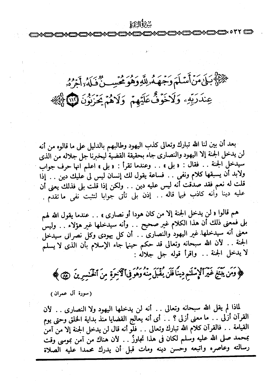 هم قالوا {لَن يَدْخُلَ الجنة إِلاَّ مَن كَانَ هُوداً أَوْ نصارى} . . عندما يقول الله لهم بلى فمعنى ذلك أن هذا الكلام غير صحيح. . وأنه سيدخلها غير هؤلاء. . وليس معنى أنه سيدخلها غير اليهود والنصارى. . أن كل يهودي وكل نصراني سيدخل الجنة. . لأن الله سبحانه وتعالى قد حكم حينما جاء الإسلام بأن الذي لا يسلم لا يدخل الجنة. . واقرأ قوله جل جلاله: {وَمَن يَبْتَغِ غَيْرَ الإسلام دِيناً فَلَنْ يُقْبَلَ مِنْهُ وَهُوَ فِي الآخرة مِنَ الخاسرين} [آل عمران: 85]