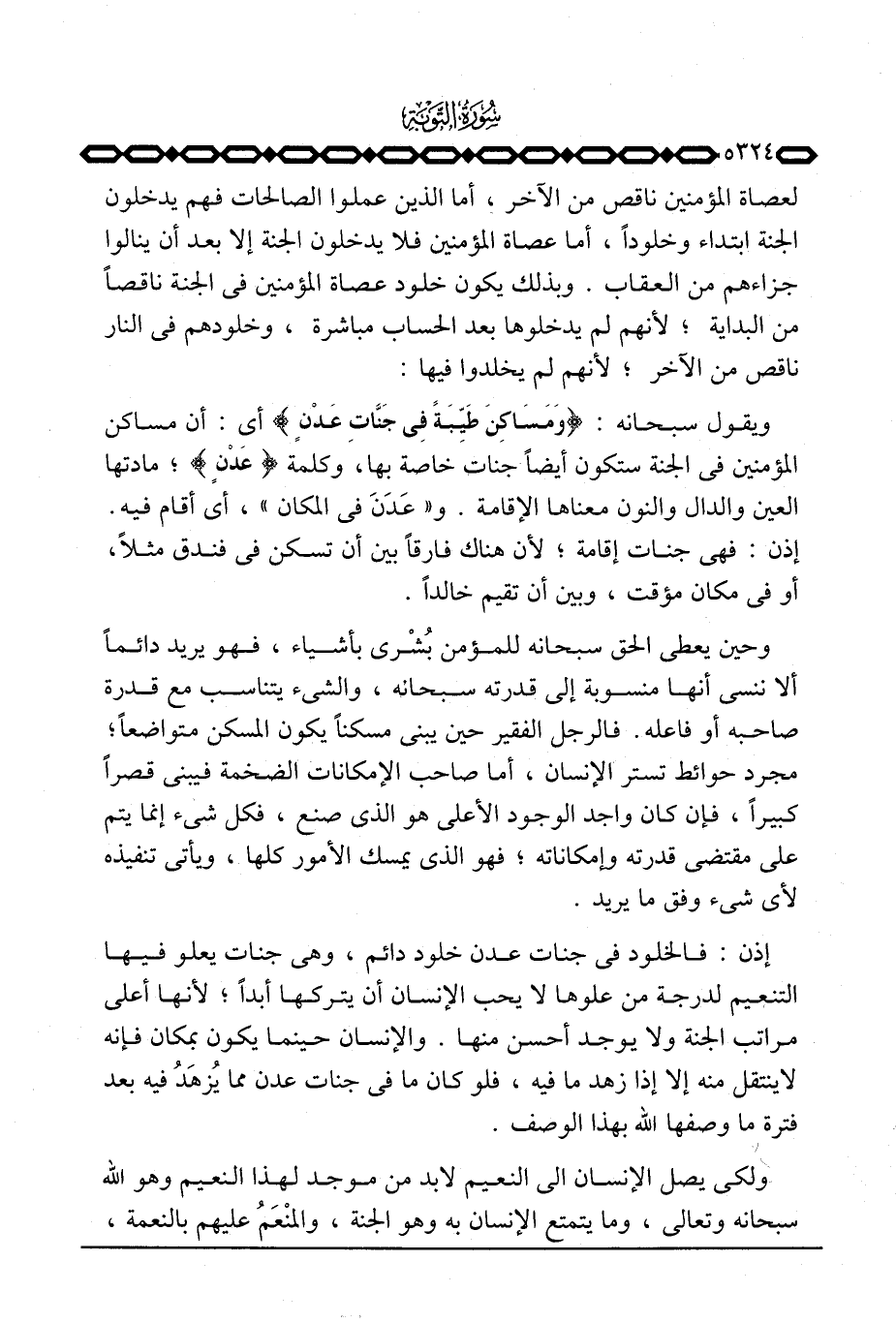 ويقول سبحانه: {وَمَسَاكِنَ طَيِّبَةً فِي جَنَّاتِ عَدْنٍ} أي: أن مساكن المؤمنين في الجنة ستكون أيضاً جنات خاصة بها، وكلمة {عَدْنٍ} ؛ مادتها العين والدال والنون معناها الإقامة. و «عَدَنَ في المكان» ، أي أقام فيه. إذن: فهي جنات إقامة؛ لأن هناك فارقاً بين أن تسكن في فندق مثلاً، أو في مكان مؤقت، وبين أن تقيم خالداً.