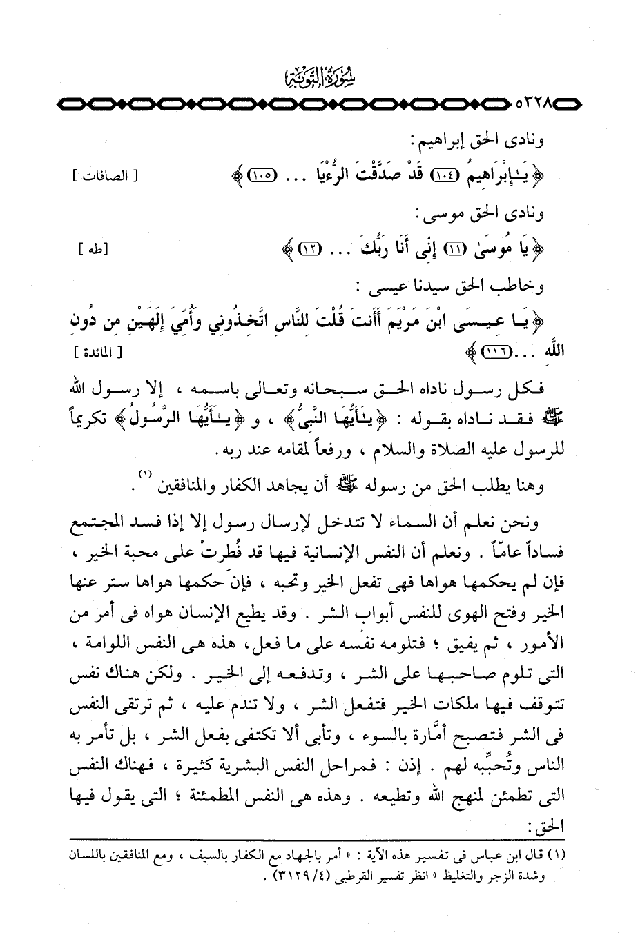 ونحن نعلم أن السماء لا تتدخل لإرسال رسول إلا فسد المجتمع فساداً عامّاً. ونعلم أن النفس الإنسانية فيها قد فُطِرتْ على محبة الخير، فإن لم يحكمها هواها فهي تفعل الخير وتحبه، فإن حكمها هواها ستر عنها الخير وفتح الهوى للنفس أبواب الشر. وقد يطيع الإنسان هواه في أمر من الأمور، ثم يفيق؛ فتلومه نفسه على ما فعل، هذه هي النفس اللوامة، التي تلوم صاحبها على الشر، وتدفعه إلى الخير. ولكن هناك نفس تتوقف فيها ملكات الخير فتفعل الشر، ولا تندم عليه، ثم ترتقي النفس في الشر فتصبح أمَّارة بالسوء، وتأبى ألا نكتفي بفعل الشر، بل تأمر به الناس وتُحبِّبه لهم. إذن: فمراحل النفس البشرية كثيرة، فهناك النفس التي تطمئن لمنهج الله وتطيعه. وهذه هي النفس المطمئنة؛ التي يقول فيها الحق:
