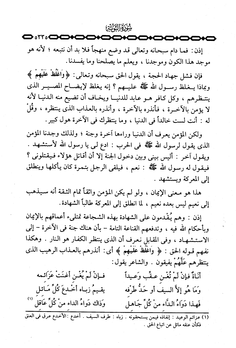 إذن: وهم يُقْدمون على الشهادة بهذه الشجاعة تمتلئ أعماقهم بالإيمان وبأحكام الله فيه، وتدفعهم القناعة التامة - بأن هناك جنة في الآخرة - إلى الاستشهاد، وفي المقابل نعرف أن الذي ينتظر الكفار هو النار. وهكذا نفهم قوله الحق: {واغلظ عَلَيْهِمْ} أي: أنذرهم بالعذاب الرهيب الذي ينتظرهم عَلَّهُمْ يفيقون. والشاعر يقول: