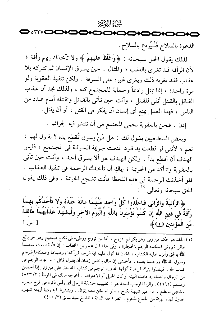 وبعض السطحيين يقول لك: هل مَنْ يسرق تُقطع يده؟ نقول لهم: نعم؛ لأنني لو قطعت يد فرد لمنعت جريمة السرقة في المجتمع، فليس الهدف أن أقطع يداً. ولكن الهدف هو ألا يسرق أحد، وأنت حين تأتي بالعقوبة وتتأكد من الجريمة؛ إياك أن تأخذ الرحمة في تنفيذ العقاب. فلو أخذتك الرحمة في هذه اللحظة فأنت تشجع الجريمة. وفي ذلك يقول الحق سبحانه وتعالى: {الزانية والزاني فاجلدوا كُلَّ وَاحِدٍ مِّنْهُمَا مِائَةَ جَلْدَةٍ وَلاَ تَأْخُذْكُمْ بِهِمَا رَأْفَةٌ فِي دِينِ الله إِن كُنتُمْ تُؤْمِنُونَ بالله واليوم الآخر وَلْيَشْهَدْ عَذَابَهُمَا طَآئِفَةٌ مِّنَ المؤمنين}