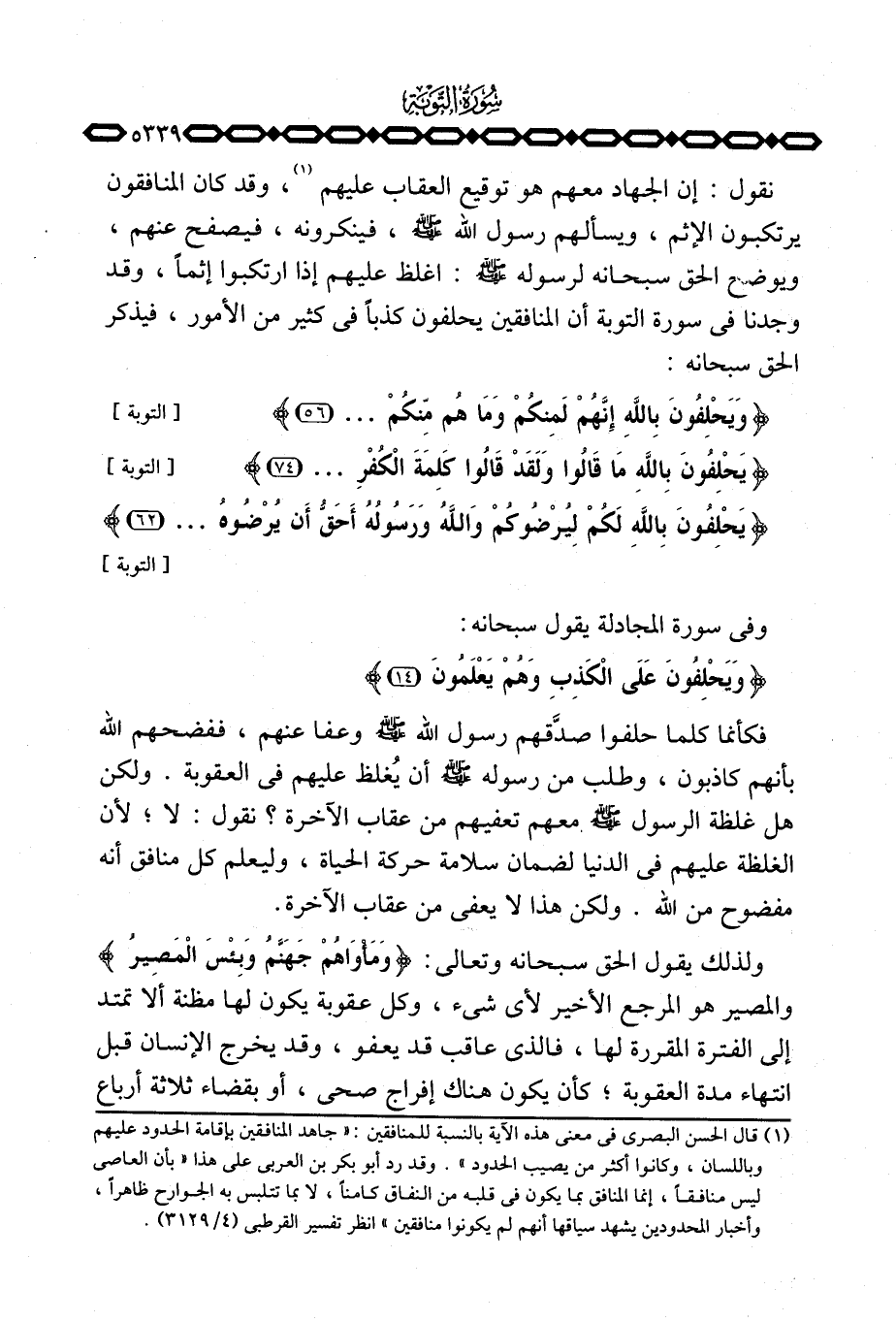 نقول: إن الجهاد معهم هو توقيع العقاب عليهم، وقد كان المنافقون يرتكبون الإثم، ويسألهم رسول الله صَلَّى اللَّهُ عَلَيْهِ وَسَلَّم َ، فينكرونه، فيصفح عنهم، ويوضح الحق سبحانه لرسوله صَلَّى اللَّهُ عَلَيْهِ وَسَلَّم َ: اغلظ عليهم إذا ارتكبوا إثماً، وقد وجدنا في سورة التوبة أن المنافقين يحلفون كذباً في كثير من الأمور، فيذكر الحق سبحانه: {وَيَحْلِفُونَ بالله إِنَّهُمْ لَمِنكُمْ وَمَا هُم مِّنكُمْ ... } [التوبة: 56]