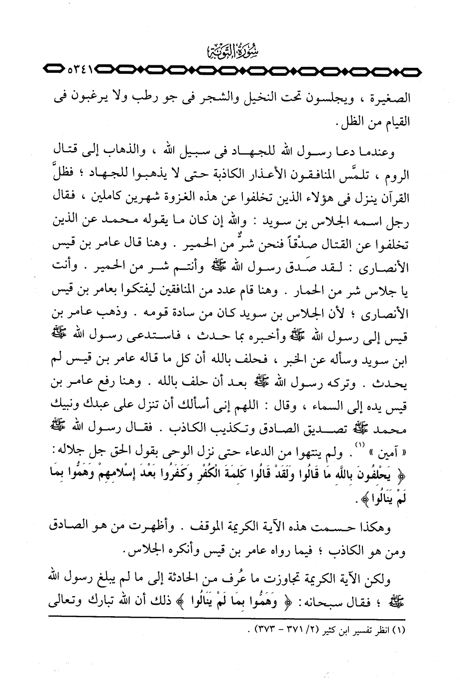وعندما دعا رسول الله للجهاد في سبيل الله، والذهاب إلى قتال الروم، تلمَّس المنافقون الأعذار الكاذبة حتى لا يذهبوا للجهاد؛ فظلَّ القرآن ينزل في هؤلاء الذين تخلفوا عن هذه الغزوة شهرين كاملين، فقال رجل اسمه الجلاس بن سويد: والله إن كان ما يقوله محمد عن الذين تخلفوا عن القتال صِدْقاً فنحن شرٌّ من الحمير. وهنا قال عامر بن قيس الأنصاري: لقد صدق رسول الله صَلَّى اللَّهُ عَلَيْهِ وَسَلَّم َ وأنتم شر من الحمير. وأنت يا جلاس شر من الحمار. وهنا قام عدد من المنافقين ليفتكوا بعامر بن قيس الأنصاري؛ لأن الجلاس بن سويد كان من سادة قومه. وذهب عامر بن قيس إلى رسول الله صَلَّى اللَّهُ عَلَيْهِ وَسَلَّم َ وأخبره بما حدث، فاستدعى رسول الله صَلَّى اللَّهُ عَلَيْهِ وَسَلَّم َ ابن سويد وسأله عن الخبر، فحلف بالله أن كل ما قاله عامر بن قيس لم يحدث. وتركه رسول الله صَلَّى اللَّهُ عَلَيْهِ وَسَلَّم َ بعد أن حلف بالله. وهنا رفع عامر بن قيس يده إلى السماء، وقال: اللهم إني أسألك أن تنزل على عبدك ونبيك محمد صَلَّى اللَّهُ عَلَيْهِ وَسَلَّم َ تصديق الصادق وتكذيب الكاذب. فقال رسول الله صَلَّى اللَّهُ عَلَيْهِ وَسَلَّم َ «آمين» . ولم ينتهوا من الدعاء حتى نزل الوحي بقول الحق جل جلاله: {يَحْلِفُونَ بالله مَا قَالُواْ وَلَقَدْ قَالُواْ كَلِمَةَ الكفر وَكَفَرُواْ بَعْدَ إِسْلاَمِهِمْ وَهَمُّواْ بِمَا لَمْ يَنَالُواْ} .