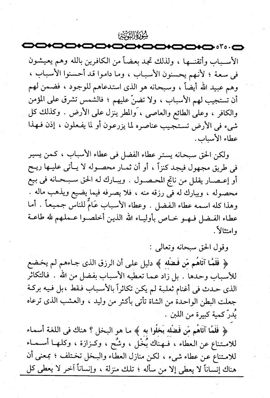 ولكن الحق سبحانه يستر عطاء الفضل في عطاء الأسباب، كمن يسير في طريق مجهول فيجد كنزاً، أو أن ثمار محصوله لا يأتي عليها ريح أو إعصار يقلل من ناتج المحصول. ويبارك له الحق سبحانه في بيع محصوله، ويبارك له في رزقه منه، فلا يصرفه فيما يضيع ويذهب ماله. وهذا كله اسمه عطاء الفضل. وعطاء الأسباب عَامٌّ للناس جميعاً. أما عطاء الفضل فهو خاص بأولياء الله الذين أخلصوا عملهم لله طاعة وامتثالاً.