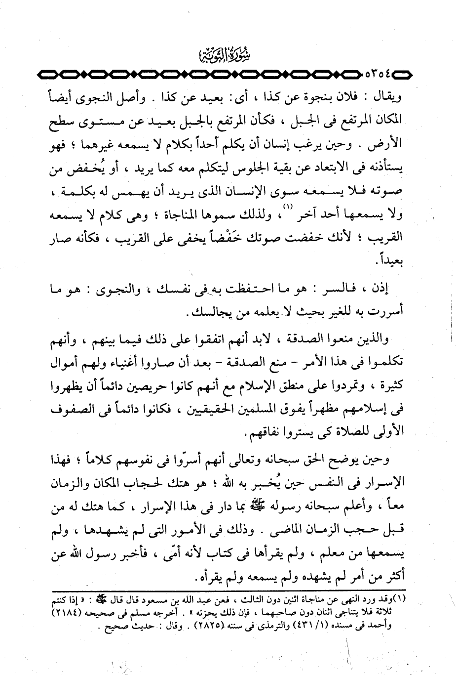 ويقال: فلان بنجوة عن كذا، أي: بعيد عن كذا. وأصل النجوى أيضاً المكان المرتفع في الجبل، فكأن المرتفع بالجبل بعيد عن مستوى سطح الأرض. وحين يرغب إنسان أن يكلم أحداً بكلام لا يسمعه غيرهما؛ فهو يستأذنه في الابتعاد عن بقية الجلوس ليتكلم معه كما يريد، أو يُخفض من صوته فلا يسمعه سوى الإنسان الذي يريد أن يهمس له بكلمة، ولا يسمعها أحد آخر، ولذلك سموها المناجاة؛ وهي كلام لا يسمعه القريب؛ لأنك خفضت صوتك خَفْضاً يخفي على القريب، فكأنه صار بعيداً.